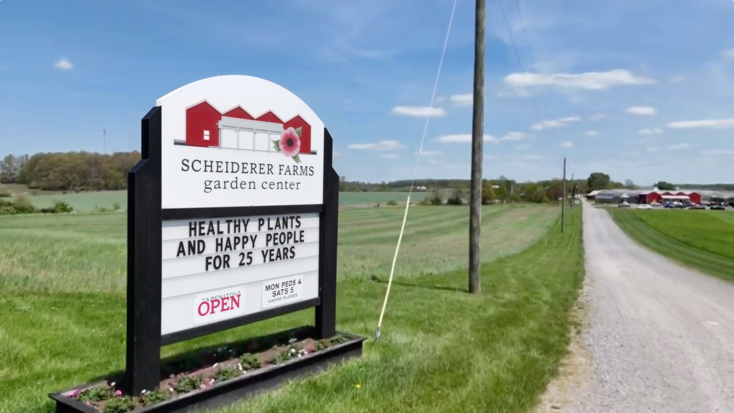 The logo system was rolled out across multiple touchpoints within the greenhouse, including exterior signage, t-shirts, flower sticks, and in-store signage. This consistent application ensures the brand feels welcoming, recognizable, and rooted in the local character of Scheiderer Farms.